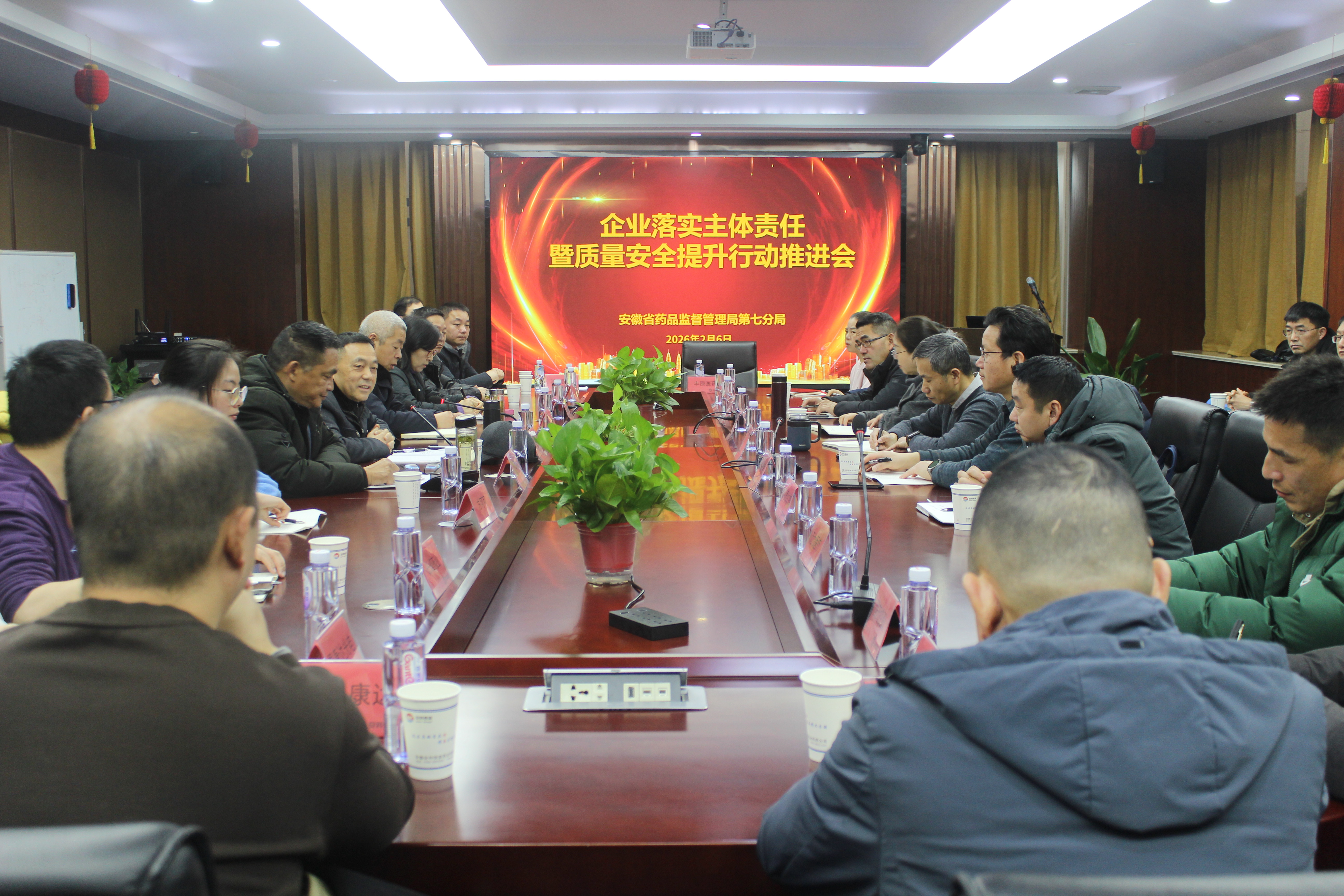 2026年2月6日上午,由安徽省药品监督管理局第七分局主办的企业落实主体责任暨质量安全提升行动工作推进会在安徽安科恒益药业有限公司二楼会议室顺利召开。省药监局第七分局虞舜来、方璋俊、倪敏、甘传会等领导出席会议,铜陵地区药品、医疗器械、化妆品生产经营企业共18家负责人、质量负责人及相关管理人员参会。